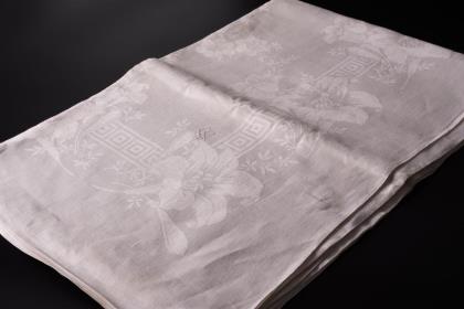 Tafeltuch mit großen Lilien- und Würfelbanddekoren. Weißstickerei-Monogramm FP.
