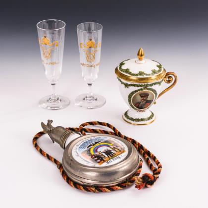 Tasse Hutschenreuther/Selb mit Datum 1915, mit dem Bildnis von Hindenburg in Uniform. / Gleich gestaltete Gläser mit Monogramm Kaiser Wilhelms II.(?) und Datum 1889 bzw. 1892, rückseitig je Monogramm "MOC". / Reservistenflasche "8. Comp. 4. Unterels. Inftr. Regt. Nr. 143 Straßburg 1901-1903"