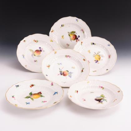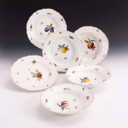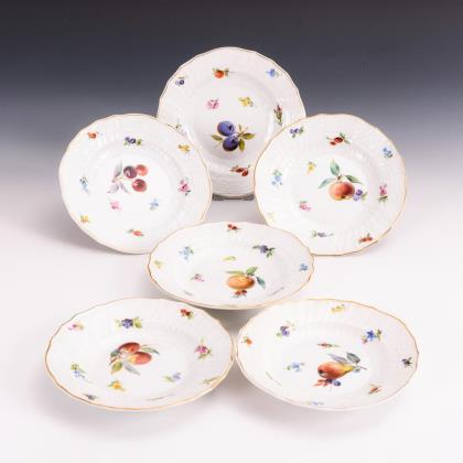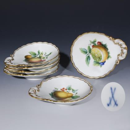 Form-Modell um 1840. Feine farbige Bemalung mit sechs verschiedenen Obstmotiven. Reliefiert, gold staffiert. Ritzmarken, Schwertermarken