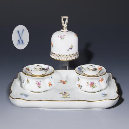 Farbig bemalt, "Streublumendekor", gold staffiert. 4 Teile: Tablett, Paar Tintenfässer, Tischglocke. Glocke mit Holz-Klöppel an Messingsteg mit eingehangener Öse. Pressmarke, Schwertermarken