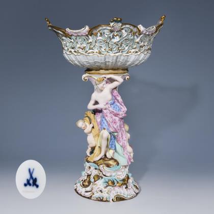 Prunkvoller Tafelaufsatz mit blüten- und rocaillereliefiertem Teller, auf mehrfach gegliedertem Fuß mit Rocaille- und Blütenrelief sowie mit Löwenköpfen