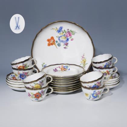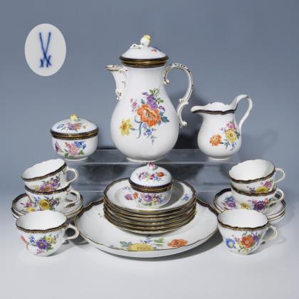 Form "Neuer Ausschnitt". 23 Teile: Kaffeekanne, Milchkännchen, Zuckerdose, Bonbonniére, Gebäckschale, 6 Tassen, 6 Untertassen, 6 Dessertteller. Farbige Blumenbemalung, kobaltblauer Rand mit goldener "A-Kante", Goldstaffage. Pressmarken, Schwertermarken, eine Schwertermarke mit Punkt