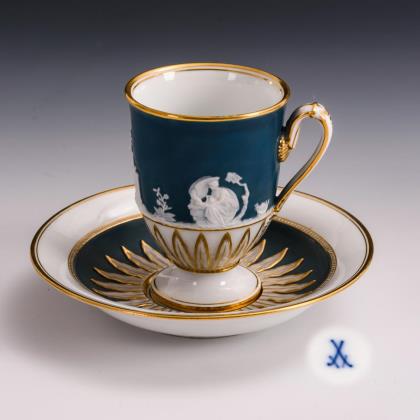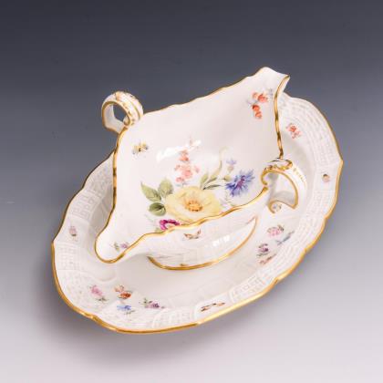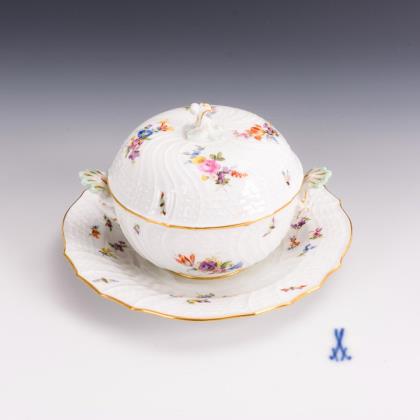 Form "Neuer Ausschnitt". Farbig bemalt, gold staffiert. "Blumen- und Insektendekor". Pressmarken, Malermarken, Schwertermarken