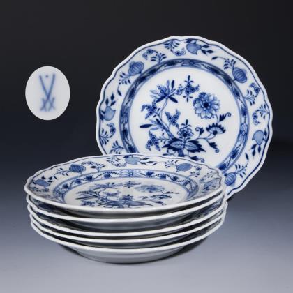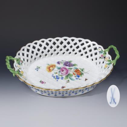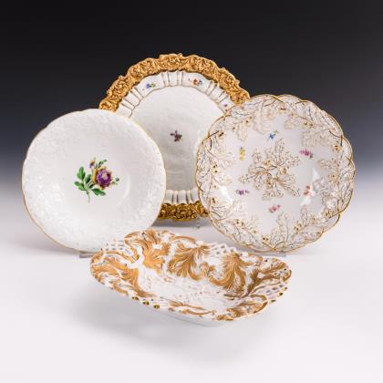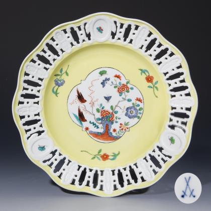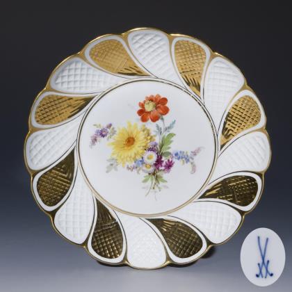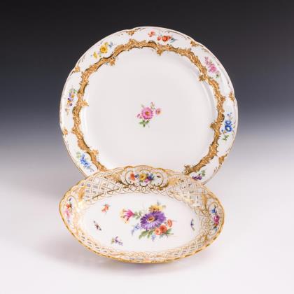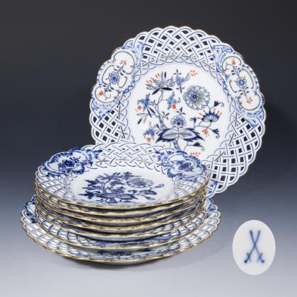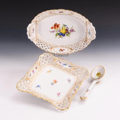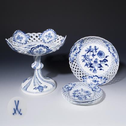 Durchbrochen gearbeitete Fahne mit drei Relief-Kartuschen. Kobaltblaue Unterglasurmalerei, "Zwiebelmusterdekor", gold staffiert. Ein Teller gold und korallenrot staffiert. Pressmarken, Malermarken, Schwertermarken