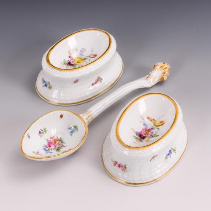 2 Salieren und Servierlöffel mit Blumen- und Insektenmalerei