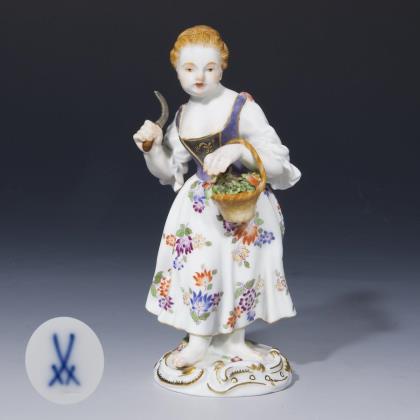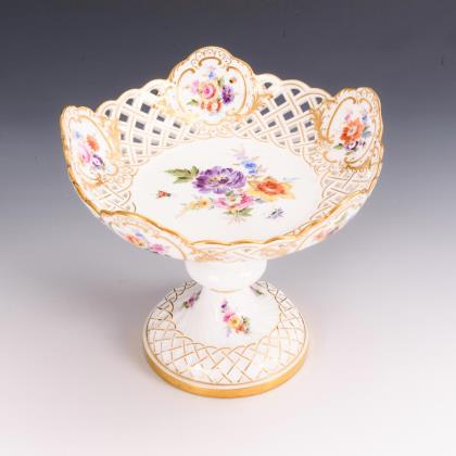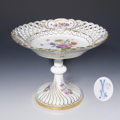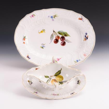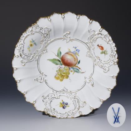 Modell von Ernst August Leuteritz 1863-1865. Reliefiert, gold staffiert, farbige Fruchtmalerei mit Blüten. Pressmarken, Malermarken. Schwertermarke zweimal gestrichen