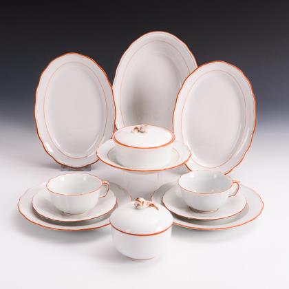 44 Teile. Form "Neuer Ausschnitt". 12 Speiseteller (Ø 24,5 cm), 12 Suppenteller, 12 Salatteller, 2 Saucieren, 3 Ovalplatten (L 30,5 cm, 34,5 cm und 43 cm), 1 Senftöpfchen, 1 Quadratschale und 1 ovale Terrine