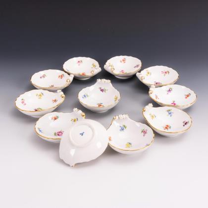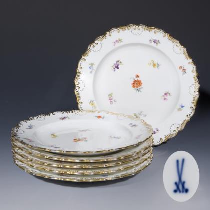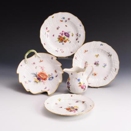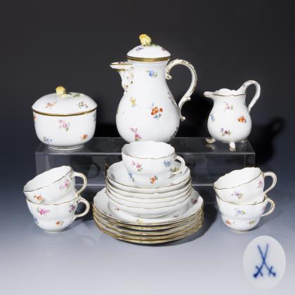 Form "Neuer Ausschnitt". 18 Teile: Kaffeekanne, Zuckerdose, Milchkännchen, 5 Tassen, 5 Untertassen, 5 Dessertteller. Farbig bemalt, "Streublumendekor", gold staffiert. Pressmarken, Malermarken, Schwertermarken. Sieben Schwertermarken zweimal gestrichen, drei Schwertermarken mit Punkt viermal gestrichen
