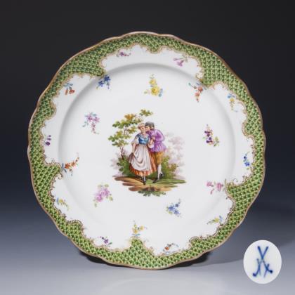 Farbig bemalt, gold staffiert, goldene Bordüre mit Blüten-Festons. Zwischen gestreuten Blüten Parkszene mit jungem Paar. Pressmarken, Schwertermarke zweimal gestrichen