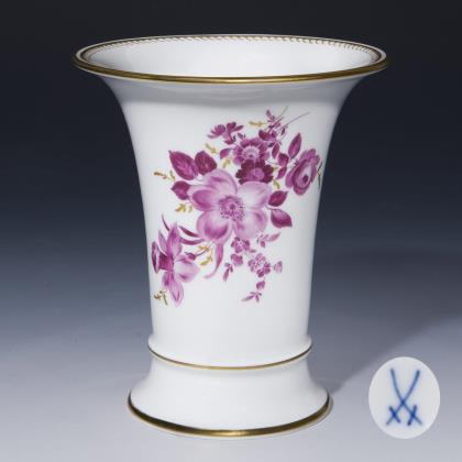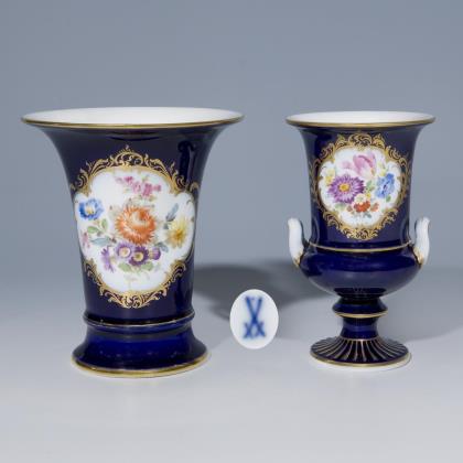 Ein Modell von Johann Daniel Schöne 1818. Frontal Goldspitzen-Reserven mit farbiger Blumenbemalung, Goldstaffage. Eine Vase mit montiertem Standfuß. Pressmarken, Schwertermarken, eine Schwertermarke mit Punkt