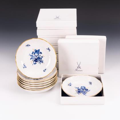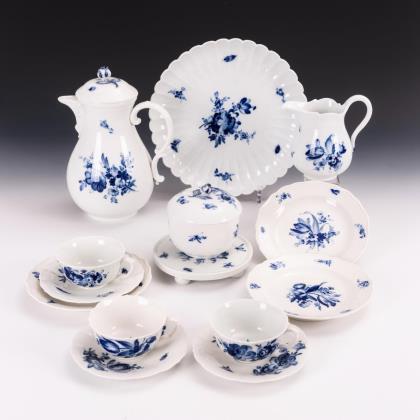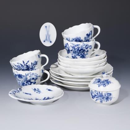 Form "Neuer Ausschnittt". 45 Teile: Teekanne, Milchkännchen, Zuckerdose, 6 Dessertteller, 6 Teetassen mit 6 Untertassen, 6 Kaffeetassen mit 6 Untertassen, 6 Mokkatassen mit 6 Untertassen. Dekor "Blaue Blume mit Insekten", gold staffiert. Kaffeetassen, Kaffee-Untertassen mit goldener Wellenkante. Pressmarken, Schwertermarken, zum Teil mit Aquatinta bezeichnet