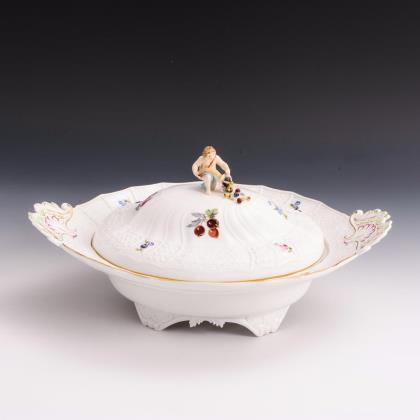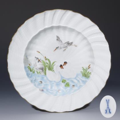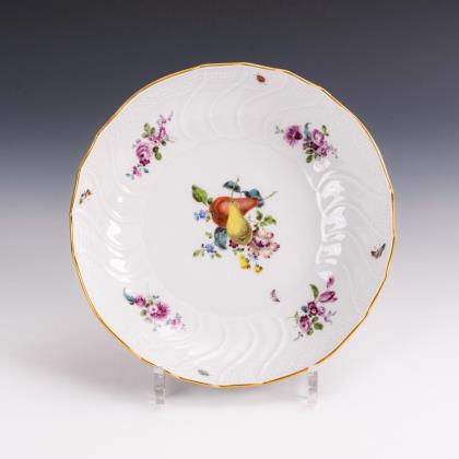 Modell von Johann Joachim Kaendler und Johann Friedrich Eberlein 1737-1741. Die gesamte Oberfläche reliefiert. Spiegel naturalistisch bemalt. Gold staffierter Rand. Pressmarke, Schwertermarke dreimal gestrichen
