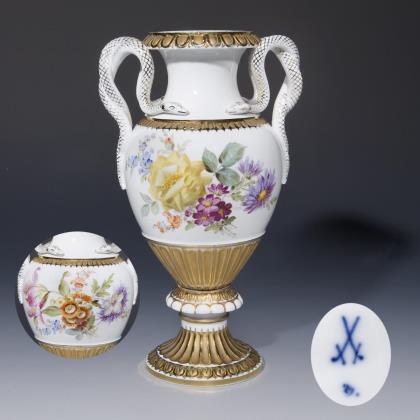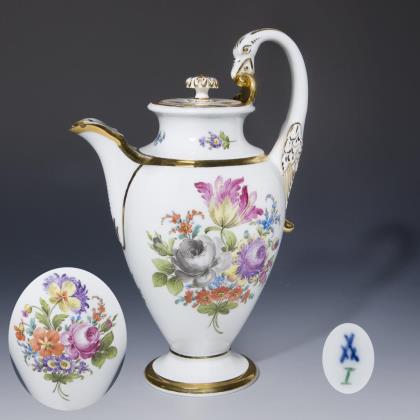 Form "Schwanenhenkel". Umlaufend florale Bemalung. Beidseits großflächige Blumenbuketts, Goldstaffage. Pressmarken, Malermarke mit Datum, Schwertermarke