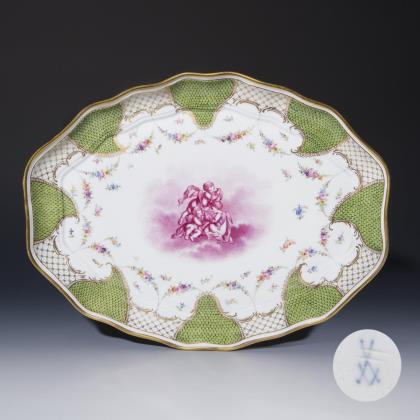 Modell von Johann Joachim Kaendler und Mitarbeiter 1755-1760. Breite Goldbordüre mit grünen Schuppenmosaik-Reserven und farbig gemalten Blüten-Festons. Im Spiegel Purpur-Camaieumalerei, "Amoretten mit Tauben" nach Vorlagen von Francois Boucher. Pressmarke, Ritzmarke, Schwertermarke zweimal gestrichen