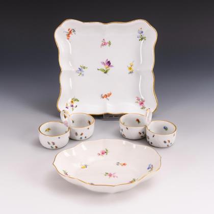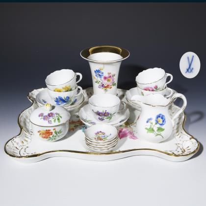 Form "Neuer Ausschnitt". 19 Teile: 1 großes Tablett, 1 Zuckerdose, 1 Milchkännchen, 1 Vase, 5 Tassen, 5 Untertassen, 5 Konfektschälchen. Farbige Blumenbemalung, gold staffiert. Pressmarken, Malermarken, Schwertermarken. Eine Schwertermarke mit Punkt