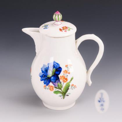 Modell von Johann Elias Zeisig, genannt Schönau 1774. Indisch-Dekor mit Fels-, Blumen- und Vogelmalerei. Ritzmarke, Pressmarken, Schwertermarke zweimal gestrichen