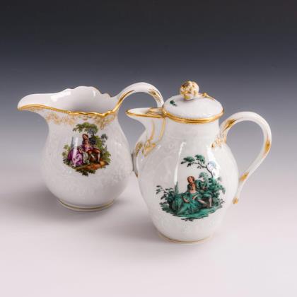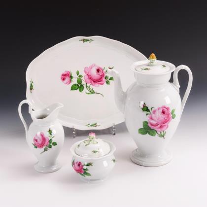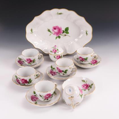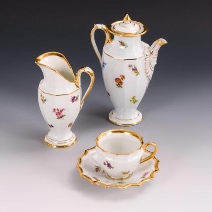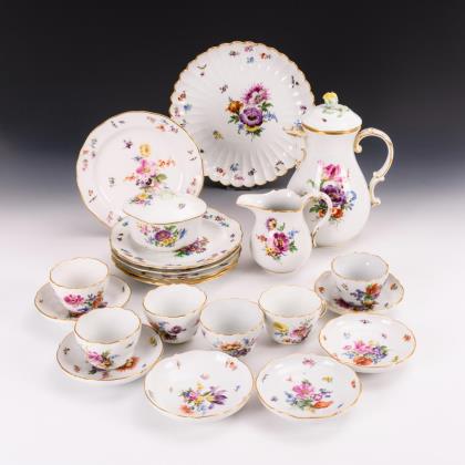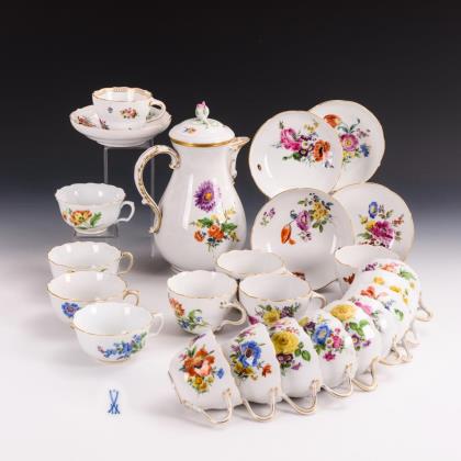 Form "Neuer Ausschnitt". Kaffeekanne (H 24 cm), 4 Teetassen, 14 Kaffeetassen (davon 1 Tasse mit etwas verschiedenem Dekor) und 5 Untertassen