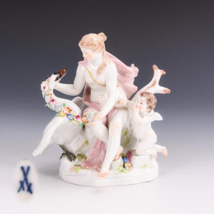 Auf einem Baumstumpf sitzende Leda, eine Blumengirlande um den Schwan an ihrer Seite windend
