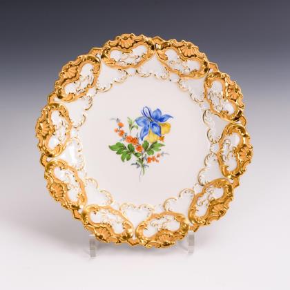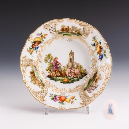 Teller in der Form "Neuer Ausschnitt" mit stabdurchbrochener Fahne, auf Rundfuß. Im Spiegel zwei kleine Parklandschaften mit einer galanten Szene