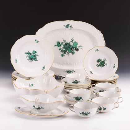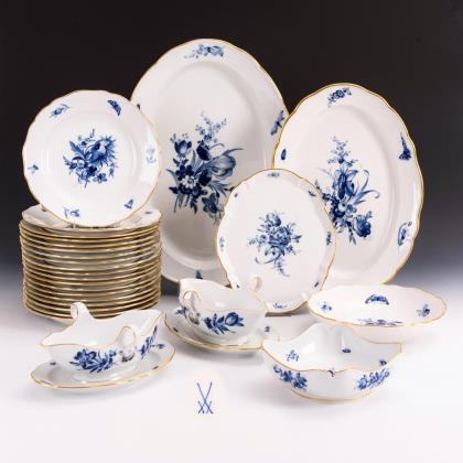 26 Teile. Form "Neuer Ausschnitt". 19 Speiseteller, 2 Saucieren, 1 Quadratschüssel (18,5 x 18 cm), 1 runde Schale (Ø 24,5 cm), 2 Ovalplatten (L 41,5 und 49 cm) und 1 ovales Tablett (L 27,5 cm)