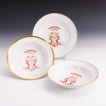 Glatte Form. 2 Suppenteller und 1 Speiseteller mit der Darstellung eines von einer Freiherrenkrone bekrönten, ligierten Monogramms ("L ...")