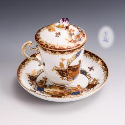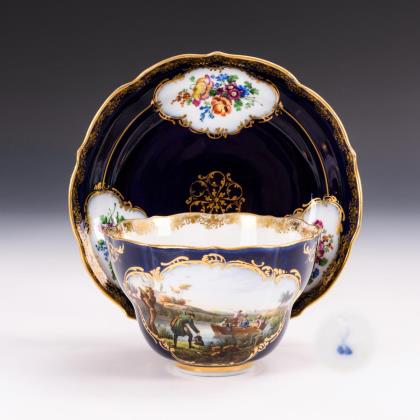 Form "Neuer Ausschnitt". Schauseitig auf der Tasse eine Rocaillekartusche mit der Darstellung eines Jägers und einer Herrengruppe bei der Entenjagd, auf der Untertasse drei Rocaillekartuschen mit Blumenbuketts
