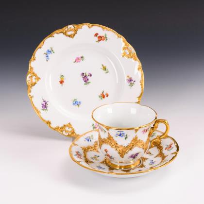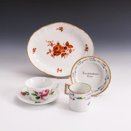 2x Schwertermarke mit Stern, Marcolini-Zeit, 1774-1814: Zylindertasse (H 6,5 cm) und Untertasse (Ø 12,5 cm) mit Vergißmeinnichtmalerei sowie der Bezeichnung "Freundschaftliches Andenken" im Untertassenspiegel. Ovalschale "Neuozier" mit korallenroter Blumenmalerei (L 22,5 cm). / 1x Knaufschwerter "I", um 1820: konische Tasse (H 5 cm) und Untertasse (Ø 13 cm) mit dem gemalten Dekor "Rote Rose"
