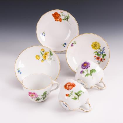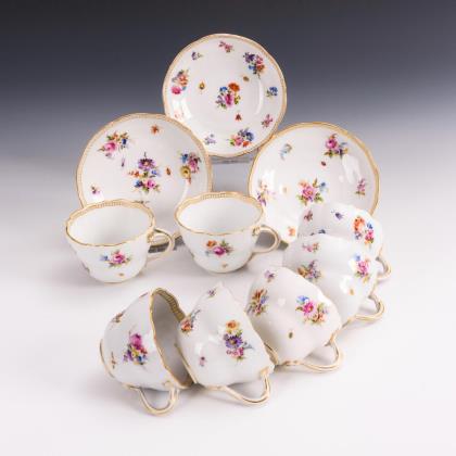7 Tassen und 3 Untertassen mit Blumenmalerei