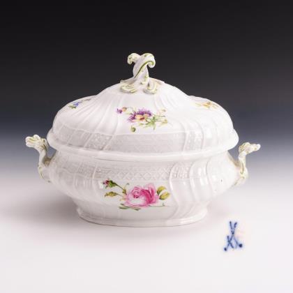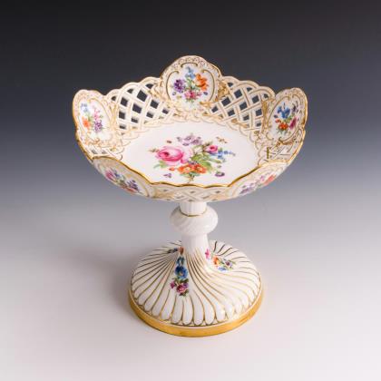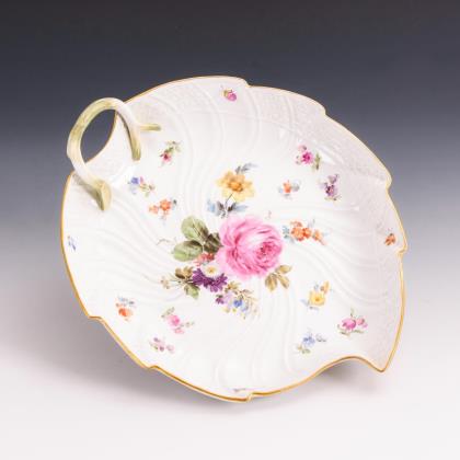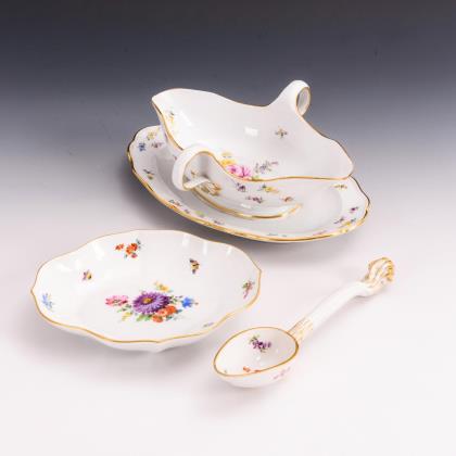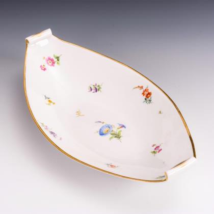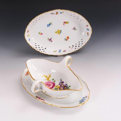 Sauciere mit zweiteiliger Blumenmalerei (L 26 cm) und Durchbruchschale mit Streublümchenmalerei (L 25 cm)