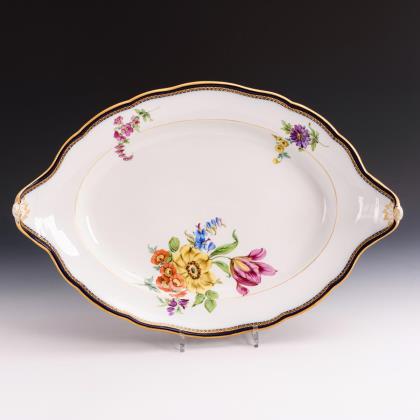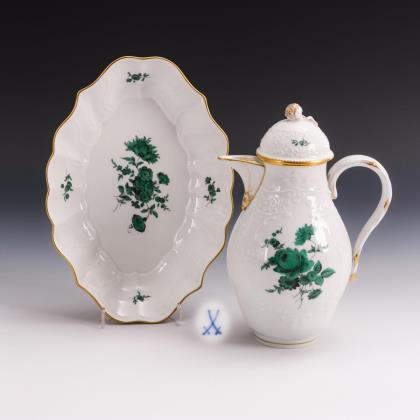 Kaffeekanne mit Streublümchenmalerei (H 22,5 cm) und Ovalplatte mit Blumenbukett (L 33,5 cm)
