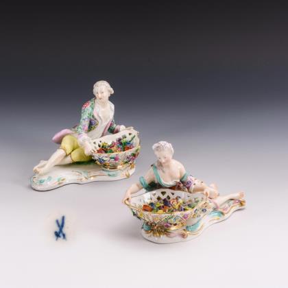 Je an einer Durchbruchschale mit Blüten lagernde Dame bzw. lagernder Herr