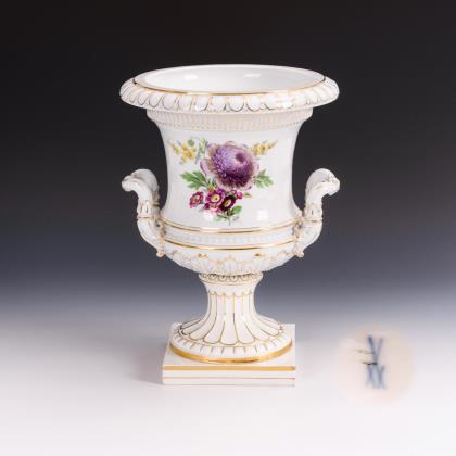 Kratervase mit zwei Henkeln sowie Blatt- und Zungenbandrelief. Beidseitig ein Blumenbukett