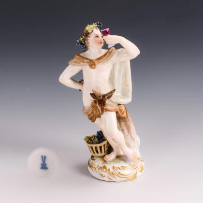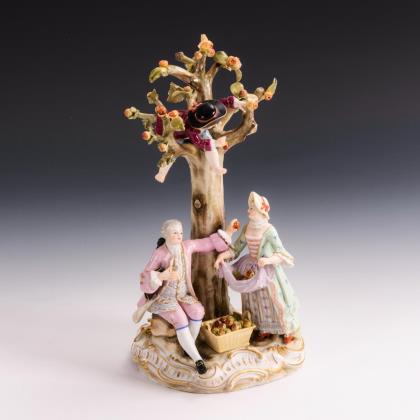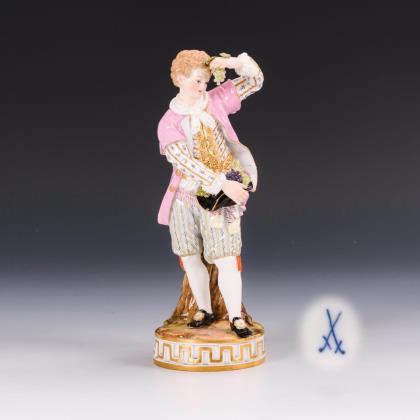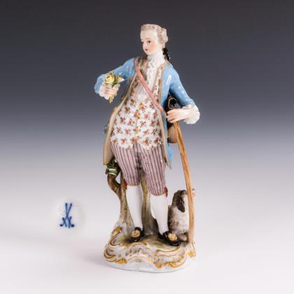 Auf einem Rocaillesockel stehender Kavalier mit Stab und Rosenstrauß