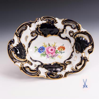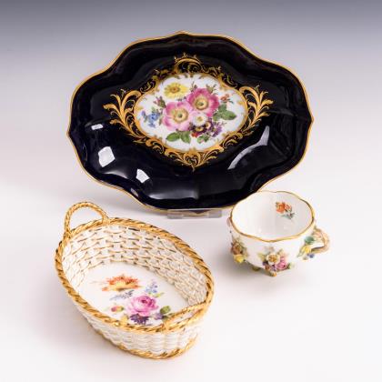 Schälchen mit Kobaltfond und Blumenmalerei (L 18,5 cm), ovaler Flechtkorb (L 14,5 cm) und Mokkatasse mit Blütenbelag (H 4,5 cm)