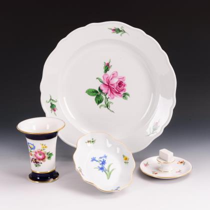 Gemüseteller "Rote Rose" (Ø 35,5 cm), Kratervase mit Kobaltbändern (H 13,5 cm), Vierpassschale (L 18,5 cm) und Streichholzschachtelhalter (H 6 cm)