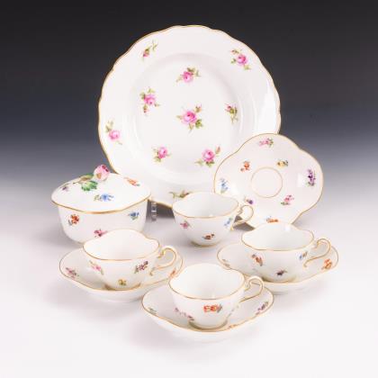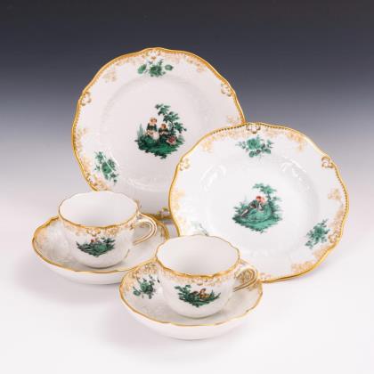 Form "Neuer Ausschnitt". 2 Teetassen, 1 Untertasse, 4 Kuchenteller (Ø 18,5 cm) und 2 Frühstücksteller (Ø 19,5 cm)