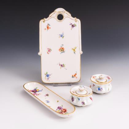 Mit Streublümchenmalerei. Frühstücksbrett (15 x 25,5 cm), 2 Tintenfässer (H 5,5 cm) und Stiftschale (L 23,5 cm)