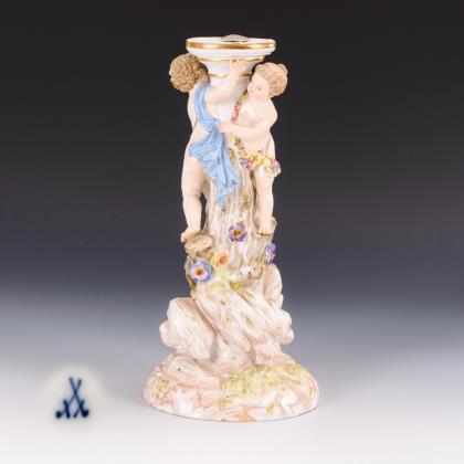Zwei auf einem Rocaillesockel stehende Putten mit Fass, Warenpaket und Tuchballen