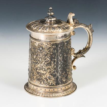 Floral reliefierter Korpus mit feinen Rocaillengravuren und Widmung: "Dem lieben Bruder und der lieben Schwägerin am 10. April 1876 von Th. J. Glien & Frau". Innen vergoldet