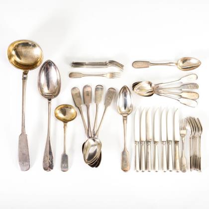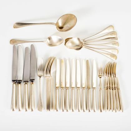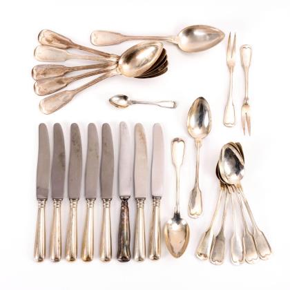 Schlichtes Besteck für 4-8 Personen, mit verschlungener Monogrammgravur "GN". 6 Gabeln, 4 Messer, 7 Löffel, 7 Dessertgabeln, 8 Dessertmesser, 1 Vorlegelöffel