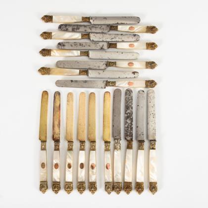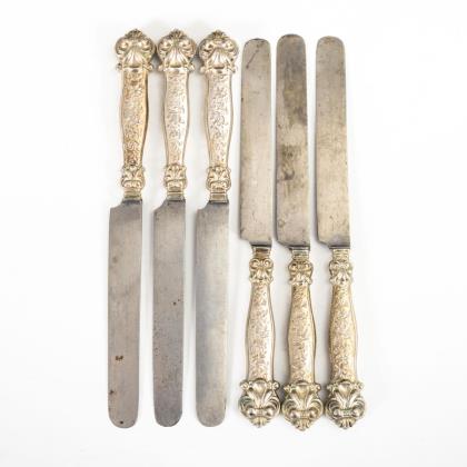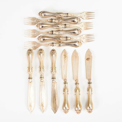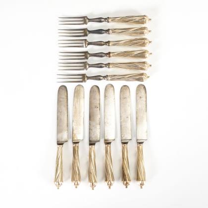 Seltenes Besteck mit godronierten Silbergriffen: 6 Gabeln mit 3 Zinken und 6 Messer mit breiter Klinge