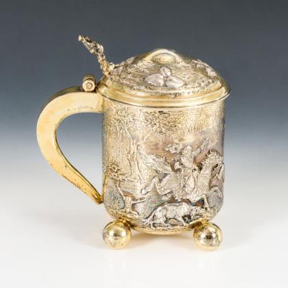 Reich reliefierter Krug mit historisierender Jagdszene und gewölbtem Deckel mit Blattmotiven. Auf 4 Kugelfüßen