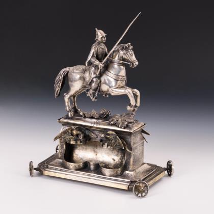 Seltenes Tintenzeug auf Rädern mit 2 herausschwenkbaren Fässchen und lose aufgesetzter Reiterplastik