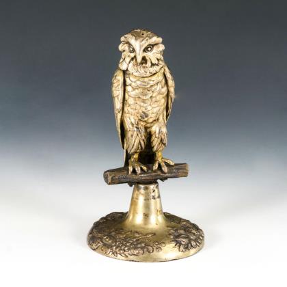 Restvergoldete Eule auf Ast und floral reliefiertem Rundfuß. Abnehmbarer Kopf mit Streulöchern