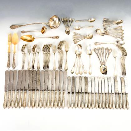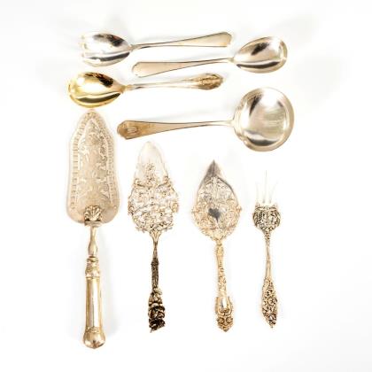 Pastetenheber, 2 Tortenheber, Vorlegegabel mit reicher Reliefierung, 1 Kelle, Salatbesteck und Vorlegelöffel mit vergoldeter Laffe