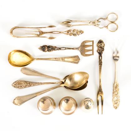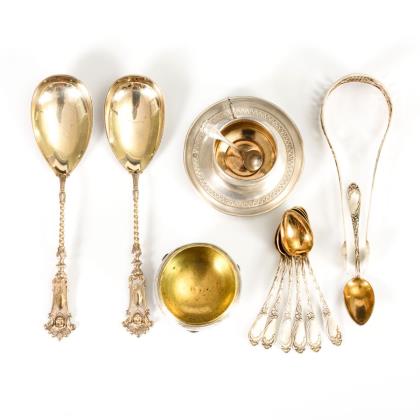 Französisches Tässchen mit UT, Zuckerschälchen um 1800, Biedermeier-Zuckerzange mit Silberfiligran, 2 Gründerzeit-Salatlöffel, 7 Mokka-Löffelchen (Koch & Bergfeld) mit vergoldeter Laffe