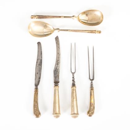 2 barocke Fleischbestecke und 2 silberne Vorlegelöffel