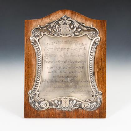 Reliefierte und gravierte Silberplatte für den "Geheimen Bergrat Hermann Undeutsch" vom "Professoren Kollegium der Bergakademie". Auf Eichenholz mit rückseitigem Klappfuß