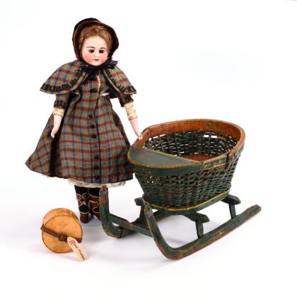 Feste braune Glasaugen, offener Mund, braune Mohairperücke. Stoffkörper mit Schlenkerbeinen, Arme aus Leder mit Porzellanunterarmen. Kariertes Reisekleid mit Pelerine, originale Absatzstiefelchen. Dazu alter Reiseschlitten mit Korbaufsatz und Proviantdose