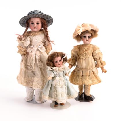 3 Püppchen in gestaffelter Größe, 2x mit Kurbelkopf, 1x mit Brustkopf. 2x Körper aus Masse, 1x aus Leder und Stoff. Weiß, beige und hellblaue Kleider mit Hüten